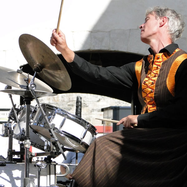 Fi des apparences ! L'habit ne fait pas le moine. Quand ils font leur entrée dans la cour du Musée des Jacobins, les musiciens de cette fanfare rennaise portent des jupes qui, rappelant celles des derviches, pourraient faire décoller les imaginaires vers les pays de l'est... Première fausse piste. Ici, les cuivres regardent vers l'ouest et jouent du blues et du rock. Les percussions font un crochet par l'Éthiopie. Les morceaux se suivent et jamais ne se ressemblent. Disco, zouk, gavotte. Peu importe ! Le vent ne connait pas de frontière. La brise estivale se sent d'ailleurs tellement chez elle, qu'elle tourbillonne dans la cour pour pousser certains à se laisser aller à la danse.
