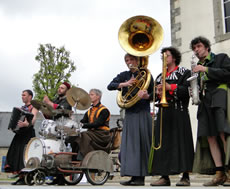 Devant la mairie, les Rennais de Sergent Pépère présentent à nouveau en pointe Bretagne leur nouvelle création Du Vent sous les robes, peaufinée au Fourneau de Brest. Les six musiciens : Pancho Bise (trombone), Freddy Sirocco (saxophone), Yasser Arafale (percussions), Ernest Hectopascal (batterie), Yvan Gilles (accordéon) et Ray Ventilo (soubassophone et trompette) jouent pour la première fois cette création dans son intégralité. Sûr que cette bouffée d'air musicale soufflera encore très prochainement sur nos côtes...